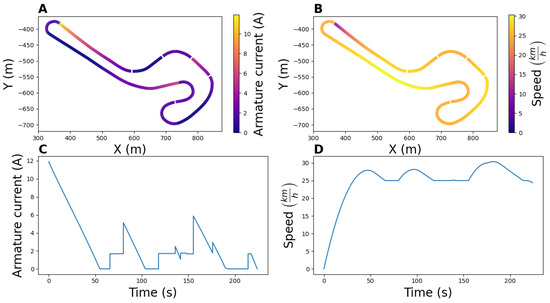 The obtained results are depicted in Figure 6. In particular, the current profile that minimizes the cost function is presented in Figure 6A,C and the optimal speed profile that fulfills the constraints is evaluated in Figure 6B,D.