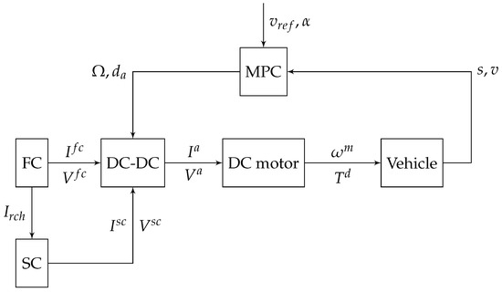 The plant states are the vehicle speed v and the traveled distance s, while the DC–DC converter duty cycle and the switching variable are the inputs. The former determines the duty cycle of the brushed motor driver and, based on the powertrain PS voltage, the armature voltage , while the latter defines the power supply of the driveline (i.e., FC or SC).