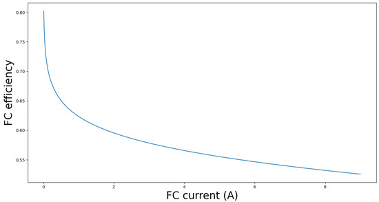 The goal of the designed controller is to optimize the hydrogen consumption of the vehicle. The efficiency of the FC decreases significantly as the drawn current increases (Figure 8); hence, the controller must be able to properly select the power source of the powertrain. Appropriate usage of the SC can overcome FC performance degradation and reduce fuel consumption.
