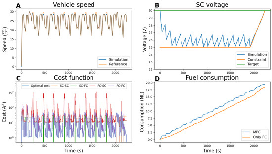 Figure 9 illustrates the results of a complete simulated SEM run. The plot in Figure 9A shows that the vehicle speed tracks the optimal speed profile computed during offline optimization. The graph in Figure 9C presents the control sequences computed by the MPC; due to the use of a binary switching variable and a prediction horizon equal to two at each sample time, four control sequences were ultimately evaluated. The control sequences that violate the constraints are marked with a negative cost function value. The plot in Figure 9B shows that the SC voltage at the end of the simulation is equal to that at the first time instant. From the figure, it is possible to appreciate that the secondary PS is crucial during the starting phase. The SC is discharged and provides the energy to put the vehicle in motion. This consideration is reinforced by the fuel consumption graph (Figure 9D). The two hydrogen consumption curves are generally parallel except at the beginning and end of the simulation. By introducing the designed MPC, the energy stored in the SC is used in the startup phase, resulting in the hydrogen consumption being lower than the benchmark.