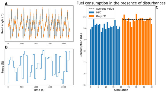 (A) Variation in road inclination angle compared to the reference angle during the simulation. (B) Random resistive force exerted on the vehicle during the simulation. (C) Fuel consumption results obtained from simulations under specified conditions.