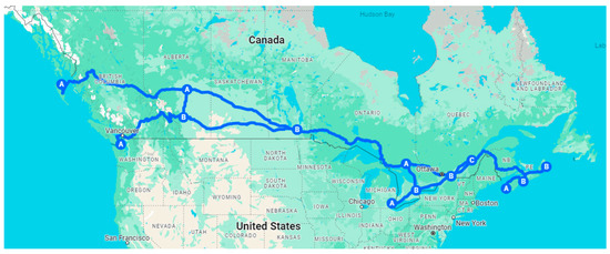 A simulation model was developed to estimate the H2 demand for heavy-duty long-haul trucks along major highways in Canada. Over 11,000 km of Canadian major highways were considered (see Figure 1). Data from provincial transportation authorities (like the Ontario Ministry of Transport) were used to estimate the annual average daily truck traffic (AADTT) flow for each of the highway segments, resulting in a large range in AADTT values from 500 trucks per day on more quiet highways to 17,000 trucks per day on the busiest segments. The model assumed that each highway segment should provide the H2 needed for all trucks that drive on that highway segment and for the total length of that segment.