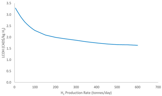 H2 production costs varied significantly across the evaluated scenarios. The average H2 production cost ranged from 2.31 CAD/kg to 2.83 CAD/kg, with the lowest cost for Scenario 4, which had, on average, the highest production volume per production facility.