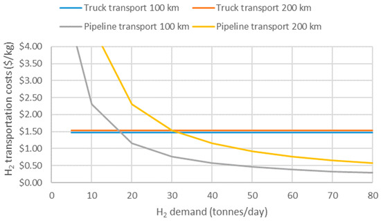 Figure 4 shows that truck transportation is more cost-effective for lower H2 demands (i.e., for refuelling sites along quiet highways) and that pipeline transportation is favored for higher H2 demands (refuelling sites along busy highways). For a distance of 100 km between production and refuelling sites, pipelines have lower costs for H2 demands starting around 17 tonnes per day, while for a 200 km transportation distance, pipelines will result in lower costs for demands over 30 tonnes per day.