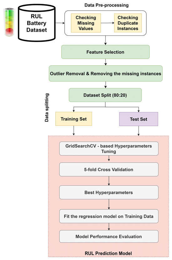 Figure 1 presents the block diagram of the proposed RUL prediction model. The process commences with data collection and preprocessing, which is succeeded by feature selection and outlier removal. The GridSearchCV method is employed for hyperparameter optimization using five-fold cross validation. The XGBoost, BaggingRegressor, LightGBM, CatBoost, and ExtraTreesRegressor machine learning algorithms are utilized to develop the RUL prediction model for predicting a battery’s RUL. Subsequently, regression performance metrics are employed to evaluate the model’s effectiveness. Finally, a feature importance analysis is conducted to identify the most influential features within the dataset.