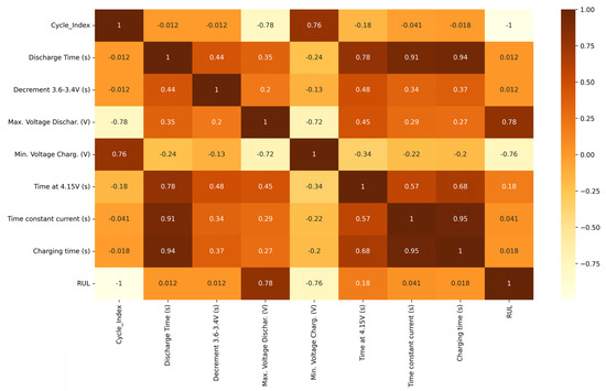 Figure 2 displays the heatmap of the RUL dataset. The heatmap reveals that the RUL and cycle index have a correlation coefficient of −1. Additionally, the maximum voltage at discharge correlates with RUL at 0.78, while the minimum voltage during charging has a correlation of −0.76 with RUL. Other features exhibit low correlations with the target variable, RUL. It is to be observed that there is an inverse relationship between the cycle index and RUL values. For instance, when the cycle index is 1, the RUL is 1112; conversely, when the RUL is 1, the cycle index is 1112. Similarly, if the RUL is 1113, the cycle index becomes 0.