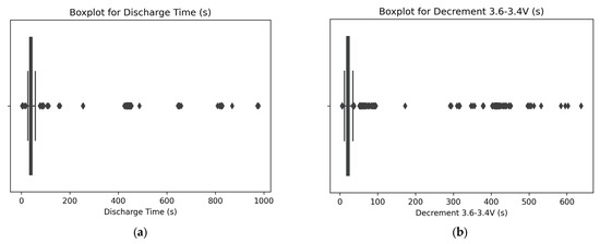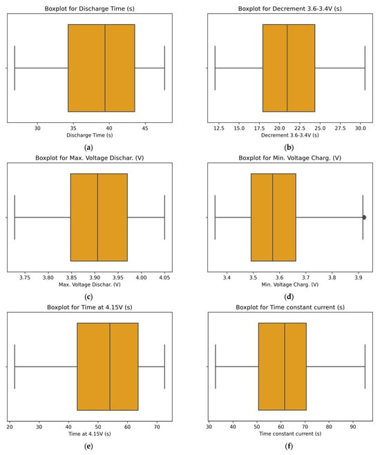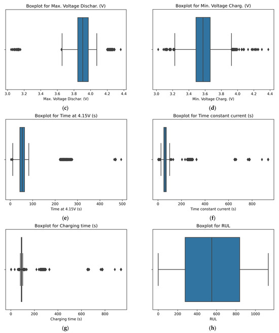Data without outliers: (a) duration of discharge, in seconds; (b) time taken for a specific voltage decrement within a range from 3.6 V to 3.4 V, in seconds; (c) highest voltage level during the discharge process in volts; (d) lowest voltage level observed during the charging phase, in volts; (e) time at 4.15 V, in seconds; (f) time constant current, in seconds; (g) charging time, in seconds; and (h) RUL of battery.