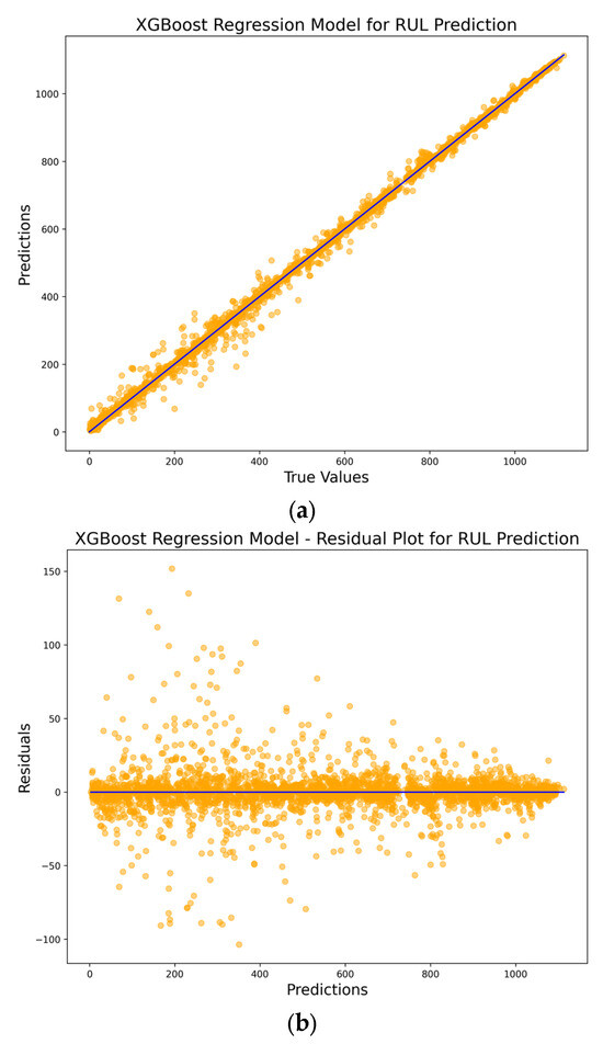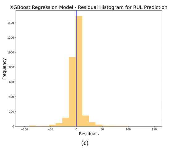 Figure 5c displays the residual histogram of the XGBoost algorithm-driven RUL prediction model. This histogram offers a distribution of the prediction errors, providing insights into their spread and frequency. A bell-shaped curve centered at zero would indicate that the model’s errors are both randomly distributed and unbiased.