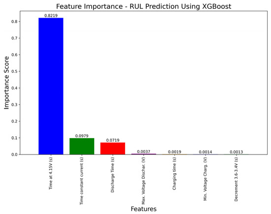 Figure 6 illustrates the Feature Importance Plot. It shows the relevance or importance of various features in predicting the RUL values of batteries. A score closer to 1 suggests high importance, while a score closer to 0 indicates lower importance. Features with higher importance scores can be crucial for ensuring that the model generalizes well to unseen data. The “Time at 4.15 V (s)” feature stands out, with the highest score of 0.8219, making it the most significant feature for predicting RUL among all of the listed features. The “Time Constant Current (s)” feature has a score of 0.0979; this feature holds significant importance. The “Decrement 3.6–3.4 V (s)” feature has a score of 0.0013; this feature has the least importance among all the listed features, and its contribution to predicting RUL is minimal.