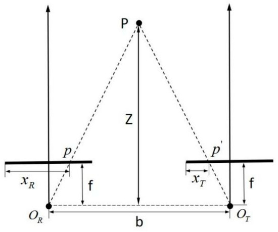 According to the principle of binocular ranging, in an ideal state, the parallax of the image we obtain is inversely proportional to the depth information (distance), with the parallax of the image represented by d [26]. According to the principle of triangle similarity, we can obtain the relationship shown in Formulas (7) and (8) and calculate the value of Z.