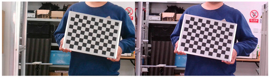 where (u, v) are the coordinates of P in the pixel coordinate system; and the coordinates of point P in the world coordinate system are, where R is the rotation matrix and T is the translation matrix. is the internal reference matrix of the binocular camera, and is the external reference matrix of the binocular camera. The binocular camera takes pictures of the checkerboard grid calibration plate at different angles, as shown in Figure 6.