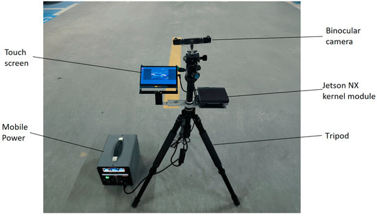 The vehicle detection and localization system is based on the Jetson NX embedded development board. It is equipped with a binocular camera and a portable display, and it uses the Linux operating system for environment building and development. With the improved target detection algorithm and the fused binocular vision localization function, the system is able to achieve accurate vehicle detection, ranging and localization and has the potential to be applied in a variety of scenarios. The hardware composition of the system is shown in Figure 8.