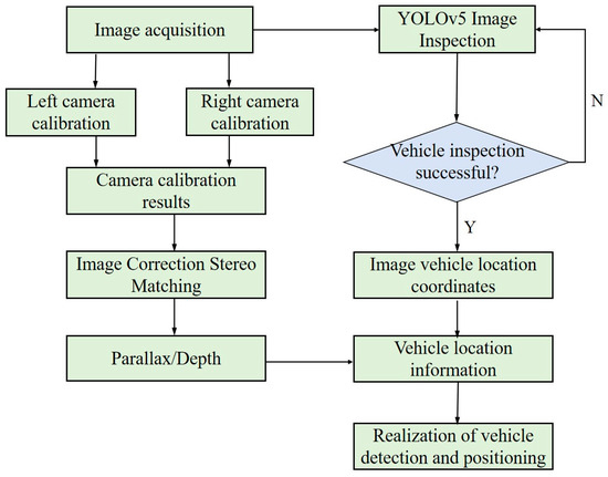 Based on the depth information of the binocular vision system and the target detection results, the distance and position of the vehicle can be calculated. The parallax value obtained by stereo matching is combined with the internal and external parameters of the camera to calculate the 3D coordinates relative to the camera using the principle of triangulation [31]. By aligning the camera coordinate system with the real-world coordinate system, the distance and position of the vehicle in the real world can be obtained. The software design flow chart is shown in Figure 9.