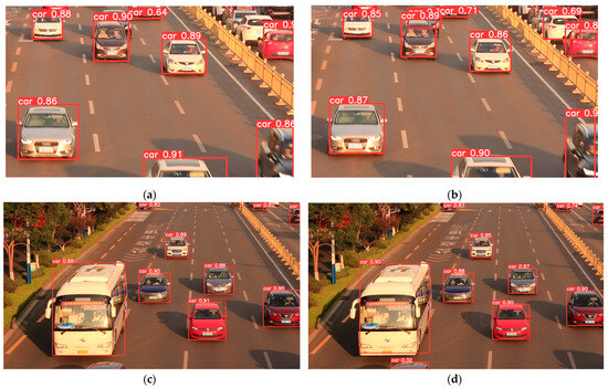 The detection of vehicles using the improved YOLOv5 target detection algorithm involves increasing the attention mechanism used in the vehicle detection task. By automatically learning the key vehicle feature regions, the attention mechanism reduces attention to irrelevant regions to improve the accuracy of detection. Using the model trained before and after the improvement to detect vehicles in the same scene, the improved model has a better effect on the detection of occluded regions as well as small target vehicles. The effect of vehicle detection before and after the improvement is shown in Figure 11.