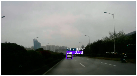 The experimental process using the improved vehicle detection model combined with binocular vision positioning technology involved vehicle detection and positioning experiments. In order to verify the effect of vehicle detection and positioning, the experiments were conducted on vehicles without using positional distance. When combined with binocular ranging, accurate detection of the vehicle was achieved. In addition, distance information relative to the binocular camera was shown at the top of the frame, enabling accurate implementation of the detection and positioning function. From the positioning effect shown in Figure 12, it can be seen that the vehicle detection and positioning system proposed in this paper can accurately detect the vehicle information in front and output the corresponding distance. This method enables real-time and accurate completion of the detection and positioning of the vehicle.