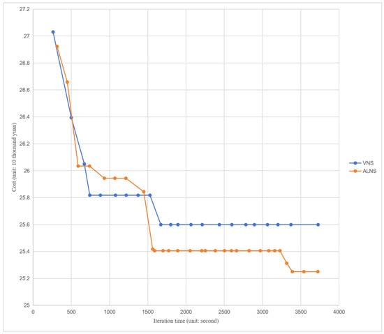 It is evident from Figure 2 that the variable neighborhood search algorithm demonstrates superior search efficiency compared to the adaptive large neighborhood search within a short timeframe. When the program’s running time is under 1500 s, the solution cost of the variable neighborhood search is lower than that of the adaptive large neighborhood search.