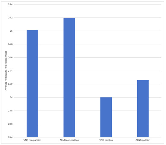 To enhance solution efficiency, customers are grouped into multiple regions based on their geographical locations. In this section, we illustrate this approach using data sets with 1100 customers and dividing into nine regions. The comparative results between partitioned and non-partitioned scenarios are presented in Figure 4. The partition experiment demonstrates an average reduction of 3.87% in the total cost compared to the non-partitioned result, indicating a significant degree of optimization. After partitioning the data set, the objective values of VNS and ALNS decrease by 4.05% and 3.69%, respectively. The optimization level achieved through partitioning is comparable for both algorithms in this data set.