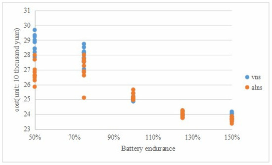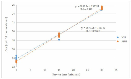 Sensitivity experiments were conducted by varying the service time by reducing it from 30 min to 15 min or 0 min. The experimental results are illustrated in Figure 7. From the scatter plot in Figure 7, it is evident that the relationship between distribution cost and customer time is nearly linear. Comparing the trajectory curves of the two algorithms, it is observed that the ALNS program is more sensitive to the reduction in customer service time, while the VNS exhibits a relatively slower response to the change in time.
