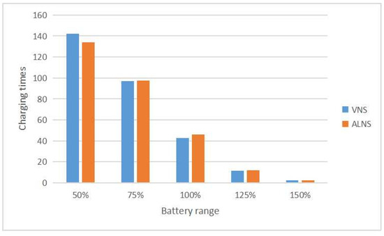 From the experimental results and data in Figure 8, it is evident that the vehicle cost increases with a reduction in the vehicle range. Conversely, as the vehicle range increases, the vehicle cost decreases relative to the original solution. However, there is no significant difference in the resulting cost between the 125% battery range and the 150% battery range. To investigate this phenomenon, the charging times of the experimental results with 125% and 150% battery quantities are statistically analyzed, and the results are presented in Figure 9.