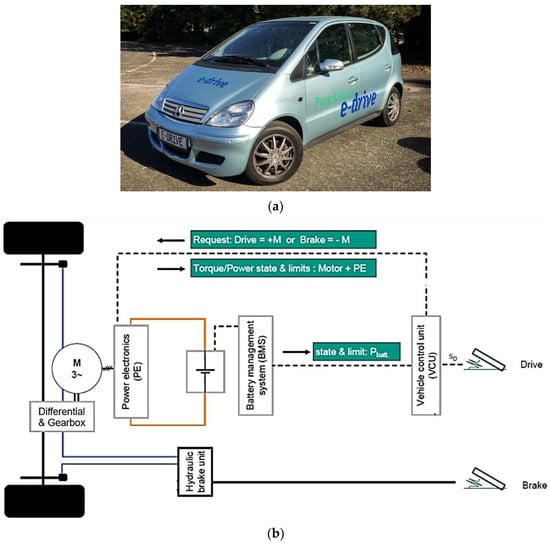 This work proposed a NARX sigmoid model to interpret the driving moment from the accelerator pedal position, implementing single hidden layer sigmoid networks similar to those applied in [,]. Besides the accelerator position value, additional quantities are required to estimate the corresponding moment, which are the electrical motor angular speed and the vehicle speed. Figure 1a shows the vehicle under test (VUT). A simplified representation of the control unit functions influencing the transmission behavior between the accelerator pedal and the electric motor is illustrated in Figure 1b. The regenerative braking system is not considered in this work.