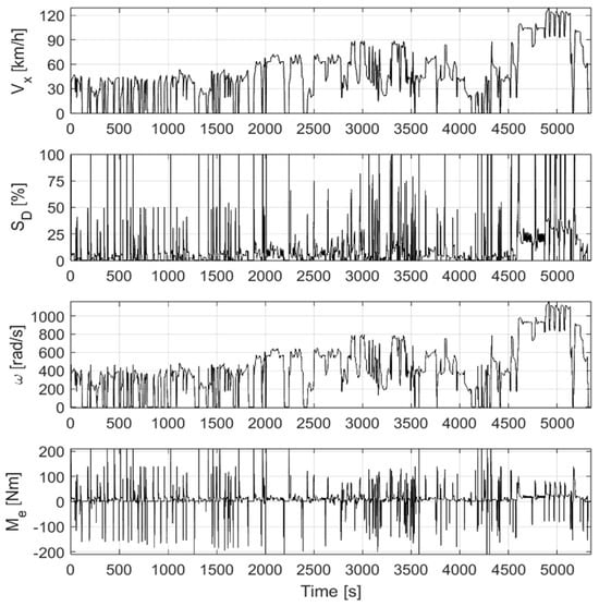 Figure 5 shows the simulation of the quantities corresponding to the driving route, including the inputs Vx, SD, and ω, and the only output, Me. The maneuver lasts for 5600 s, and the data samples are taken with a sampling time of 0.1 s, which yields 56,000 training data samples. The implemented data are based on a predefined path, which needs to be prepared before performing the test run. An improvement to this approach would be integrating a path optimization algorithm so the vehicle could plan the path autonomously, as in [].