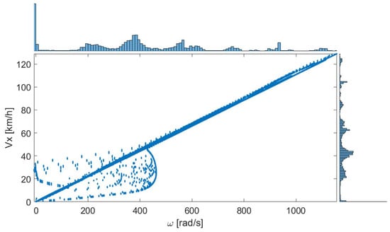 The profile shapes of Vx and ω seem analogous, so it might be assumed that having one would be sufficient. Nonetheless, subtle but significant variations manifest by correlating Vx and ω, as in Figure 6. The differences are significant at rotational speeds of less than 450 rad/s. Moreover, the data points are not aligned for Vx and ω at higher speeds.