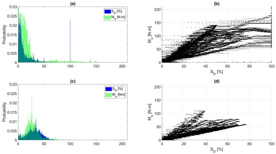The identified model was able to define the majority of the points with high precision. Few points are overestimated, with a maximum difference of 0.5 Nm. The worst errors appear at ω less than 100 rad/s and SD larger than 50%, where the motor’s moment is underestimated. The error increased gradually from an SD equal to 50% until it reached −9.4 Nm at an SD equal to 100%. The locations of these errors take us back to Figure 4b. Some discontinuities were observed around the addressed areas, which promotes the possibility of casing these errors due to excluded operational points.