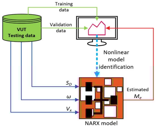 The dark green areas in Figure 7a,c represent the intersection between SD and Me. The dissimilarity in the data distribution between SD and Me proves that Me cannot be predicted with SD alone. Another important observation in Figure 7 is the larger area of operating points covered by the RWD compared to the Artemis cycle, which proves that even dynamic standard driving cycles do not provide enough data to accurately identify the motor’s moment, although they might cover the whole speed range of the VUT. For instance, Figure 7d shows that the maximum SD value recorded during the Artemis cycle is 77% and the maximum Me is 109.55 Nm, while the RWD maneuver stimulated the coverage of the whole range for both SD and Me, as shown in Figure 7b. On one hand, the complete dataset is used to identify the NARX model. On the other hand, the validation dataset is the Artemis driving cycle for highways with a maximum speed of 130 km/h, selected due to its dynamic features. The schematic diagram in Figure 8 demonstrates the identification process of the NARX model.