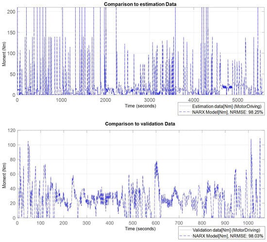 In this case, the fitness values are the NRMSEs of the estimated moment compared to the training and validation data sets. The NARX model could accurately predict the corresponding motor moment based on the given inputs, even for such a highly dynamic maneuver. The Artemis driving cycle is used as a validation dataset for the NARX model. It is desired to advocate that the identified driving moment model represents the actual vehicle. So, the moment prediction model is validated using the measured data from actual test vehicle measurements. The validation objective is to find whether the data used to train the NARX model resemble the targeted system. The measured data from the field test in [] are used for this purpose, in which the driver performed a dynamic actuation for the pedal to generate a challenging test case lasting about 385 s. The results in Figure 12 demonstrate a high Pearson’s correlation coefficient (Pearson’s correlation coefficient: Wikipedia, https://en.wikipedia.org/wiki/Pearson_correlation_coefficient#cite_note-3, accessed on 2 March 2024) of 0.994 between the estimated and measured motor’s moment, which approves the accuracy of the identified NARX model.