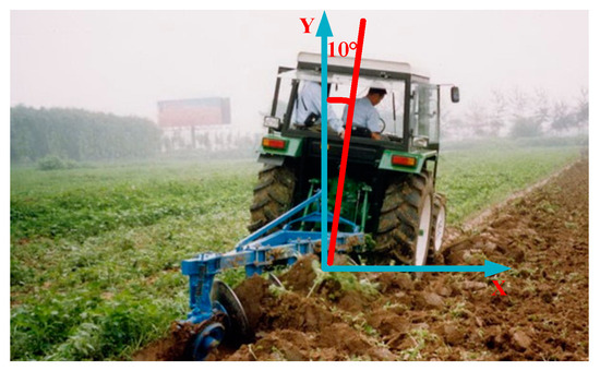 Obstacle recognition is a core aspect of vehicle assisted driving control systems [1,2,3]. As assisted driving systems for passenger cars are becoming more and more mature, they are gradually being applied to intelligent agricultural machines. Compared with passenger cars, tractors always have one side of their wheels stuck in the soft soil after ploughing, so that the vision sensor always has an inclination of about 10° [4], as shown in Figure 1. This affects the detection of obstacles. In addition, violent shaking of the tractor can reduce the accuracy of the camera in recognizing obstacles in the field [5]. The hardware cost of the tractor’s assisted driving system and the lack of controller arithmetic are also key technologies that need to be solved urgently.