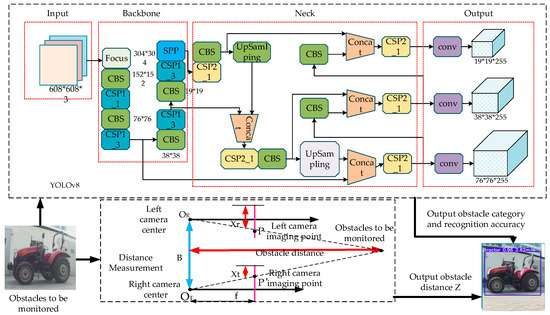 The YOLOv8 algorithm classifies and identifies field obstacles through neural networks, and the binocular ranging algorithm outputs the distance of field obstacles using the binocular parallax principle, and the two combine to complete the monitoring task. The principle of the whole monitoring model is shown in Figure 2. The backbone network of the YOLOv8 model is the CSPDarkNet [35] model, which has a large number of convolutional modules and needs to occupy a large amount of controller arithmetic. In this paper, the convolution module is optimized with MobileNetV2, which can reduce nearly half of the computation without changing the number of feature maps and save the computational resources of the unmanned tractor. At the same time, the SE attention mechanism [36] is embedded in the backbone network, which improves the field obstacle detection accuracy while reducing the computational volume. The activation function of YOLOv8 is the SiLU activation function [37], which is less robust and the recognition confidence polarization is serious in the process of tractor field operation. In this paper, we adopt the FReLU activation function with stronger robustness, which is more suitable for the actual operating conditions of the tractor. The neck network of YOLOv8 model has two fewer convolutional connection layers than the previous feature pyramid network FPN [38], and it is not easy for the large feature maps to be fused with the small feature maps, so this paper uses the BiFPN path aggregation network, which fuses feature maps at different scales. The detection accuracy is further improved while saving the controller computational resources.