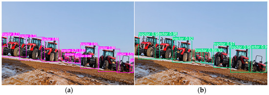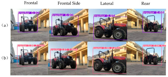 The field environment is diverse and complex, with obstacles potentially appearing at any angle within the field of view of the unmanned tractor. They may be facing away from the camera or positioned sideways. The original model’s performance is unstable; when obstacles appear with their backs facing the camera’s recognition range, the recognition confidence decreases significantly. To verify that our model can accurately recognize obstacles from any angle, we conducted dedicated experiments. Using the vehicle-mounted camera, we captured images of obstacles from four different angles: frontal, frontal side, lateral, and rear. These captured image samples were used as the test dataset for comparative analysis. We then employed both the original YOLOv8 model and our improved model to identify the obstacles in these images, corresponding to experiments (a) and (b) respectively, as shown in Figure 12.