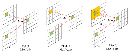 The second place extends the original activation function to a sizable activation function with pixel-level modelling capabilities by using spatial conditions in the activation function through a convolution operation. This allows the network to generate spatial conditions for each pixel in the nonlinear activation, solving the spatial insensitivity problem. The activation region of FunnelReLU can be not only rectangular, but also rectangular or curved, which makes a better match with the shape of the object itself. A comparison of activation regions of FunnelReLU, ReLU and PReLU [39] is shown in Figure 4. On the rightmost side of the figure is the original ReLU function without any modifications and additions, in the middle is the FReLU activation function with common parameter conditions added on top of the ReLU activation function, and on the rightmost side is the FunnelReLU activation function with common parameter conditions added on top of the ReLU activation function.