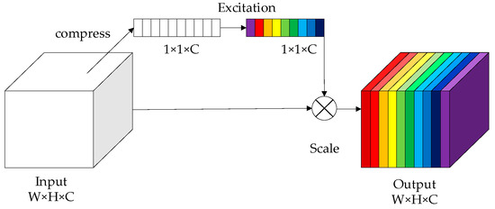 The YOLOv8 model has different utilization rates for different channels but the same weights in the pooling process, resulting in computational loss and accuracy degradation. To further improve the detection accuracy of unmanned tractor, the SE attention mechanism is embedded in the YOLOv8 model. The SE attention mechanism consists of three parts, namely, squeezing, excitation and combination, as shown in Figure 5. The compression operation is a global average pooling [41] operation, which compressed the feature map from W × H × C to a 1 × 1 × C vector map, and the excitation part consists of two fully connected layers [42] and an activation function The two fully connected layers are composed of two fully connected layers for the number of neurons to reduce the latitude and then increase the dimension, and the activation function multiplies the channel weights to complete the model excitation. The excitation part is formulated as follows.