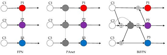 The weighting method of Equation (6) is to directly add a learnable weight, but the weight is not limited, which may cause instability in training; the weighting method of Equation (7) can scale the weight range to between 0 and 1, which is stable, but the training is very slow; the weighting method of Equation (8) is similar to Softmax [44] that can scale the range to between 0 and 1, and the training efficiency is high. In this paper, the weighting method of Equation (8) is used to extract the layers 5, 7, and 11 of the backbone network to the neck network, and compress and merge the number of its channels into the BiFPN network for multi-scale feature fusion, and finally output to the detection end.