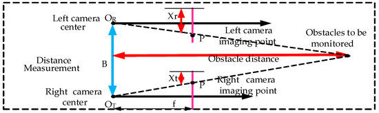 Binocular ranging uses the parallax principle to calculate the coordinates of the target point in three-dimensional space and consequently the target distance. The principle is shown in Figure 7, and the obstacle distance Z can be obtained by only obtaining the parallax information D (Xr − Xt).