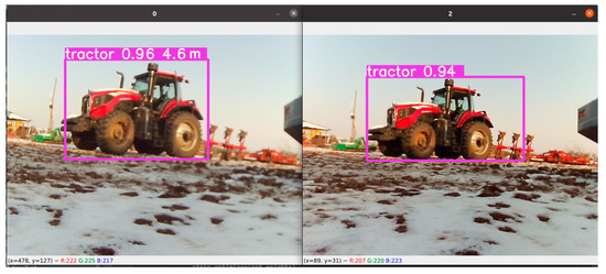 The steps of binocular ranging are as follows: firstly, the focal length, distortion coefficient, rotation matrix and translation vector and other parameters of the camera are obtained through calibration; then, the same field obstacle is photographed with the left and right cameras, and thereafter the feature points are extracted from the left and right images and matched to obtain the distance of the field obstacle relative to the tractor. The binocular ranging effect of this paper is shown in Figure 8. The left side of the figure is the main camera view, which shows the confidence level and obstacle distance; the right side is the auxiliary camera view, which only shows the confidence level. All the following sections use only the main camera viewpoint information to show the model effect.