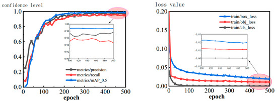 The meanings of the letters in the formulae are shown below: TP denotes the number of positive categories judged correctly, FP denotes the number of positive categories judged incorrectly, FN denotes a positive category judged as a negative category, and are the recall values corresponding to the first interpolated value at the first interpolated value in the precision interpolation segments arranged in ascending order. The overall accuracy of all categories of data is synthesized into mAP values. The parameters of the trained model are shown in Figure 9. The experimental results show that the improved YOLOv8 model has a mAP value of 98.84%, a recall value of 95.81%, a precision value of 97.90%, and a reduction in computation for the same image from 2.35 billion floating-point computations to 1.28 billion computations, which improves the average detection precision by 2.34% and reduces the amount of computation by 45.53%.