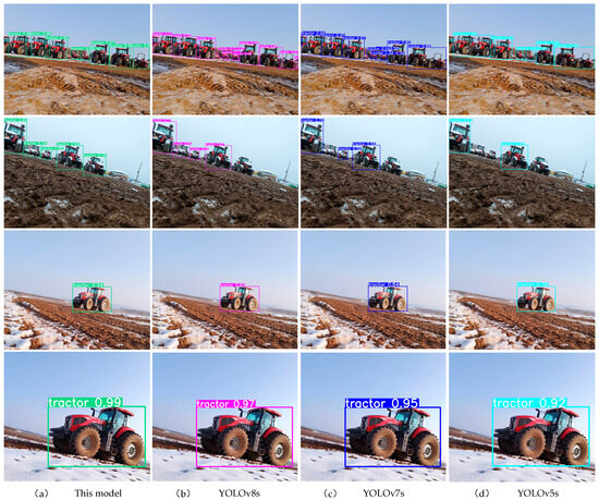 In order to verify the performance of the present model, a real-view comparison test is carried out at the Cuigou test field of China YTO Group under the right-tilt 10° view angle of an unmanned tractor. The present model is compared with the mainstream model, and different algorithms are used to train the same field obstacle dataset. The detection accuracy of the same live view obstacle is compared after the training is completed, and the results are shown in Figure 10. The test groups (a), (b), (c) and (d) in the figure are the present model, YOLOv8s, YOLOv7s and YOLOv5s models, respectively, and the results of the comparison test can be obtained as follows: compared with the other models, the present model has a low false-negative rate, high average confidence, and the confidence error of the identification of multi-obstacle is within 10%. Compared with the original model, the detection accuracy and robustness of the present model have been substantially improved.