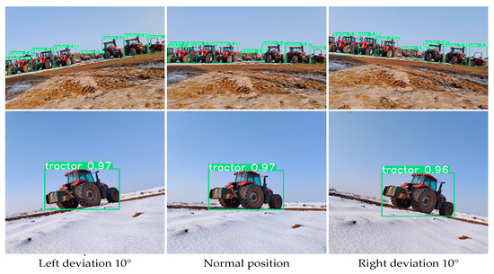 When ploughing with a tractor, the camera used for obstacle detection is often tilted, typically about 10 degrees to the left or right. This model has been improved to address the detection effect when tilted. We designed a control experiment to demonstrate that the model performs similarly well under tilted viewing angles compared to normal viewing angles. The detection results under the main camera view angle are shown in Figure 11, and it can be seen from the comparison graph that the detection performance at the tilted angle is comparable to that at the normal angle. This test result proves that even when the tractor is tilted, the model can maintain sufficient detection accuracy.