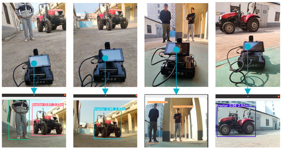 While the tractor is in motion, obstacles also move within the camera’s field of view. Moving obstacles can decrease detection accuracy. To verify whether recognition accuracy is significantly affected during movement, we conducted dynamic validation experiments. In the Ubuntu system, the camera of the unmanned vehicle is utilized to initiate obstacle detection and ranging through commands. Images of the vehicle were captured while the unmanned cart was controlled using a remote control handle to simulate the maximum ploughing speed of the tractor. The main camera view is shown in Figure 13.