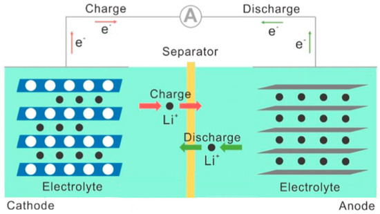 LIBs are batteries that store or discharge charge through the transfer of lithium-ions (Li+), and their charging and discharging operation is mainly accomplished through the migration of lithium-ions in and out of the anode and cathode materials. When charging, electrons (e−) are charged into the negative electrode material, while lithium-ions (Li+) are released from the positive electrode material. They are transported by the electrolyte and arrive at the negative electrode through the isolation membrane, and are then stored in the negative electrode material [12,13,14]. The opposite process occurs during discharge (see Figure 1 for details).