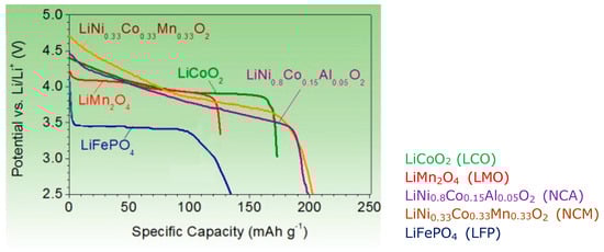 The conventional materials for LIB cathodes are transitional metal oxides with layered structures, such as LiCoO2 (LCO), LiMn2O4 (LMO), Li(NixCoyAlz)O2 (NCA), Li(NixCoyMnz)O2 (NCM), LiFePO4 (LFP), etc. [13,16,17], as shown in Figure 2.