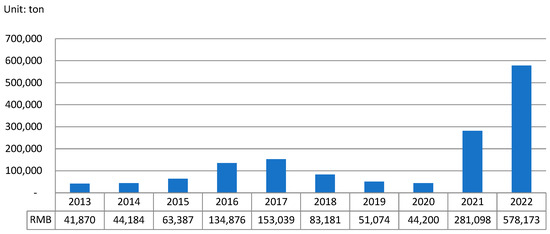 Price growth chart of battery-grade lithium carbonate. Note: 2013: RMB 41,870≒USD 6864 (exchange rate: 6.1); 2014: RMB 44,184≒USD 7220 (exchange rate: 6.12); 2015: RMB 63,387≒USD 9767 (exchange rate: 6.49); 2016: RMB 134,876≒USD 19,407 (exchange rate: 6.95); 2017: RMB 153,039≒USD 22,276 (exchange rate: 6.59); 2018: RMB 83,181≒USD 12,108 (exchange rate: 6.87); 2019: RMB 51,074≒USD 7317 (exchange rate: 6.98); 2020: RMB 44,200≒USD 6779 (exchange rate: 6.52); 2021: RMB 281,098≒USD 44,198 (exchange rate: 6.36); 2022: RMB 578,173≒USD 86,294 (exchange rate: 6.7). Source: Organized and charted by this study.