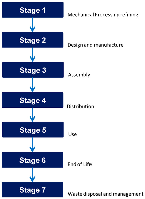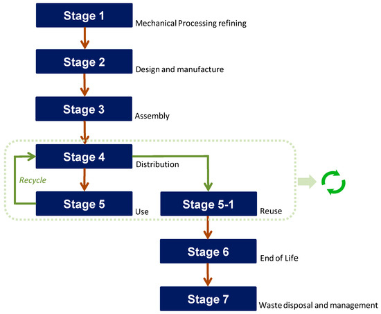 When examining the linear economy through the lens of the circular economy (CE), particularly in the context of the “reuse economy”, a notable deviation occurs as the progression approaches Stage 6 (disposal/end of life). The conventional process is circumvented by incorporating recycling and introducing an additional 5-1 “Reuse Stage” before advancing to Stage 6 and, ultimately, Stage 7 (see Figure 5).
