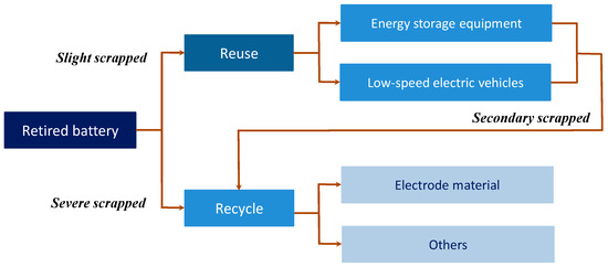 A retired battery can be “reused” (meaning reused for the “same” purpose) and is “slightly scrapped”, but a “reused” retired battery is different from a “severely scrapped” battery that cannot be “reused”. The treatment of retired batteries is shown in Figure 7.