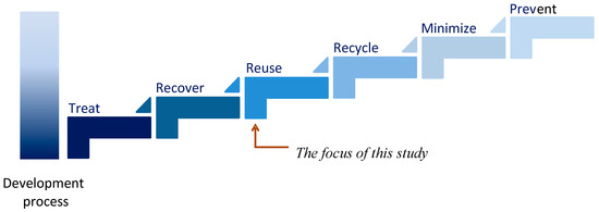 When a vehicle battery reaches the end of its life, it is usually referred to as a vehicle battery reaching 80% of its state of health (SOH). At this point, although the vehicle battery still retains about 80% of its capacity, it is no longer suitable for use in general EVs and must be retired. However, because the retired batteries still have about 80–85% of their capacity [33,68], it is not economical to decommission them. In terms of the rational development process of “treat → recover → reuse → recycle →minimize → prevent” (see Figure 8), the reuse of retired vehicle batteries is still necessary.