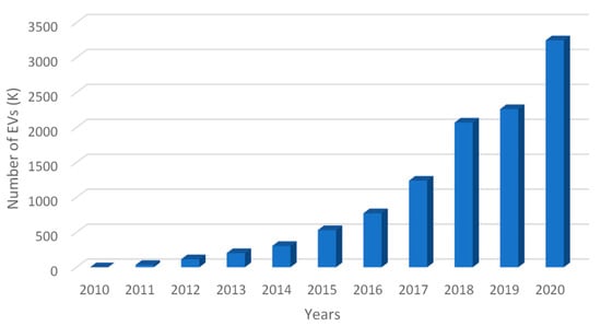 The sales of EVs have experienced a remarkable surge since their introduction to commercial markets in the early years of the last decade. In 2010, the global number of EVs on the roads was approximately 17,000. However, by 2019, this figure had skyrocketed to 7.2 million, with around 47% of EVs being registered in China. Moreover, nine countries had exceeded the milestone of 100,000 EVs in circulation, while at least twenty countries achieved market shares surpassing 1%. This substantial growth reflects the increasing adoption and popularity of EVs worldwide [4]. Figure 1 shows that the number of EVs increased significantly globally during the period from 2010 to 2020. This calls for a need to study the use of EVs in general. User opinions also play an important role in the transition from traditional cars to EVs. This work aims to clarify the opinions of Saudi society—in this case, Hail City—on the adoption of EVs. The findings may not only shape the future of transportation in Hail but also serve as a blueprint for other urban areas grappling with similar sustainability concerns.