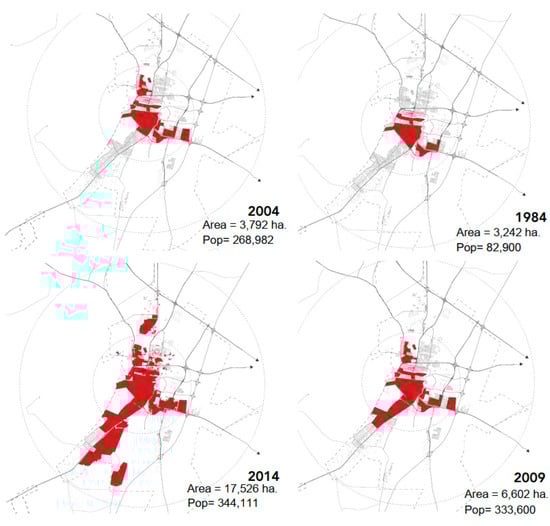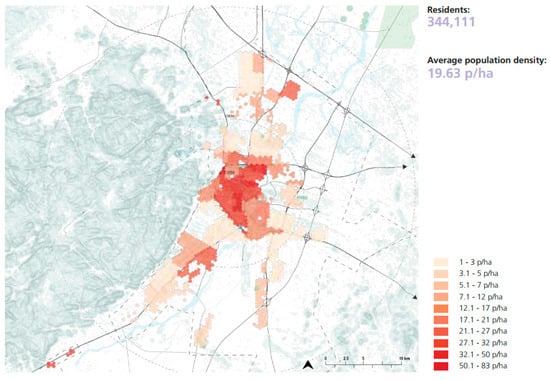 The capital of the Hail Region is Hail City (27°31′ N 41°41′ E), which is situated in northern Saudi Arabia. It is well known for its major contributions to agriculture, especially in the production of wheat. Natural scenery and historical landmarks, such as Jubbah and Shuwaymis, which have prehistoric rock art, are among the United Nations Educational, Scientific and Cultural Organization World Heritage sites around the city. Hail City’s character and significance in the region are defined by its agricultural economy and historical and ecological significance [42]. The demographic information of Hail City’s population is compiled from reliable sources, including official documents, census data, and surveys. Over time, there have been significant changes to Hail City’s urban development phases. The augmentation of community services, the growth of the population, and the construction of infrastructure are indicative of these trends. Hail was formerly a tiny community, but it has recently witnessed rapid population expansion. To fulfill the changing needs of the city and its citizens, the expansion of services and infrastructure is necessary. The area coverage of the city underwent a notable increase throughout a three-decade period. As seen in Figure 3, the city covered 3242 hectares in 1984, which was sufficient to accommodate the population of 82,900 persons living there. Significant expansion occurred as a result of development and urbanization as time went on. The city expanded to 6602 hectares by 2009, a reflection of a rapidly expanding city. However, in 2014, the acreage exploded to a massive 17,526 hectares, making the transition more apparent. Alongside this significant growth, the population of the city also increased significantly to 746,046 people in 2020 [43]. This development highlights how the urban and demographic landscape of the city is dynamic and characterized by significant expansion and development. A thorough depiction of Hail City’s population density, expressed in people per hectare, can be found in Figure 4. An essential metric for urban growth and planning is population density. This metric facilitates the evaluation of service distribution, infrastructural needs, and overall urban sustainability.