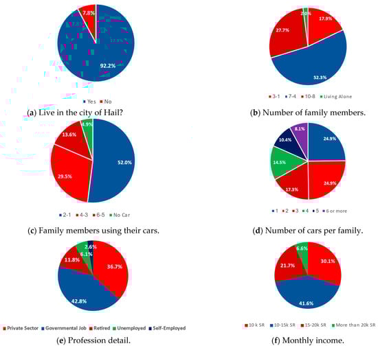 In this section, general residents’ information in Hail City is discussed. To ensure that the sample who responded to the questionnaire lives in Hail, demographic data were analyzed, and it was confirmed that 92.2% of the respondents live in Hail City, as shown in Figure 6a. The average size of families was also assessed. This information, as reflected in the survey findings, is critical in estimating the total number of households, which, in turn, influences the projected number of vehicles in the city. Figure 6b shows that the number of family members reported by the majority of participants ranges from four to seven. Families with 8–10 members are also notable, constituting 27.7% of the survey participants, and the smallest group comprises individuals living alone, representing 2.0% of the survey participants. It was also found that 52.0% of the sample reported one or two family members who use one car in each household (Figure 6c). A smaller percentage of 13.6% reported 5–6 family members sharing vehicles, and a minority of 4.9% reported not owning a car. Fewer participants, at 29.5%, reported 3–4 family members using their car. It is noted from Figure 6d that a quarter of the sample owns one car, and the same percentage of the sample owns two cars. There are 8.1% of respondents who reported more than six cars at home, which agrees with the findings published by Almutairi [30]. Figure 6e shows the respondents’ employment status, showing that the largest group works in the governmental sector (42.8%), followed by the private sector (36.7%). Retired individuals make up 11.8%, while unemployed and self-employed individuals are less common, at 6.1% and 2.6%, respectively. Regarding monthly income, as shown in Figure 6f, the largest segment of the survey participants (41.6%) earns between SR 10,000 and 15,000. Those earning up to SR 10,000 constitute 30.1% and 21.7% earn between SR 15,000 and 20,000. A smaller portion, at 6.6%, reported earning more than SR 20,000.